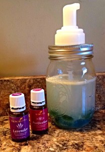 Fill your soap dispenser about 2/3 full of distilled water. Add 1-2 Tablespoons of castile soap, and 1-2 teaspoons of liquid oil. You can use any oil you might have in the kitchen. The oil helps to preserve the pump and can add a small amount of moisturizing to the soap. Add your EO’s and gently mix. Enjoy!